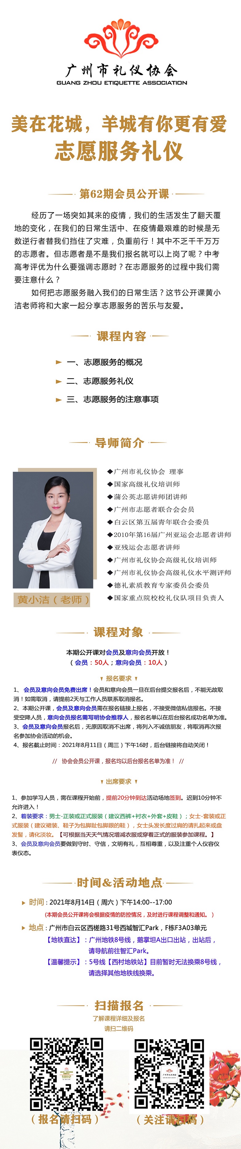 2、著裝要求:男士-正裝或正式服裝(建議西褲+襯衣+外套+皮鞋);女士-套裝或正式服裝(建議裙裝、鞋子為包腳趾包腳跟的鞋),女士頭發(fā)長(zhǎng)度過(guò)肩的請(qǐng)?jiān)饋?lái)或盤(pán)發(fā)髻,請(qǐng)化淡妝。【可根據(jù)當(dāng)天天氣情況增減衣服或穿著正式的服裝參加課程。】