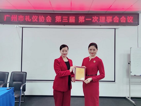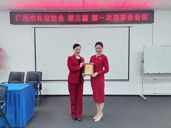 廣州市禮儀協(xié)會會長時淑妍女士為新任執(zhí)行會長彭莎女士頒發(fā)牌匾。