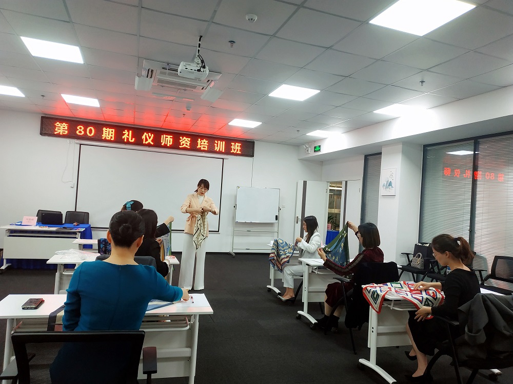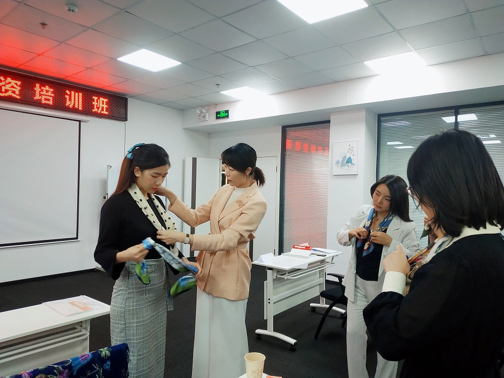 劉老師為大家講解了服裝色彩搭配等方面的理論知識,并教授學員如何根據(jù)自己的膚色來選擇適合自己的服裝、如何根據(jù)體形進行搭配服裝、如何靈活運用絲巾搭配來打造職業(yè)禮儀培訓師的專業(yè)形象。