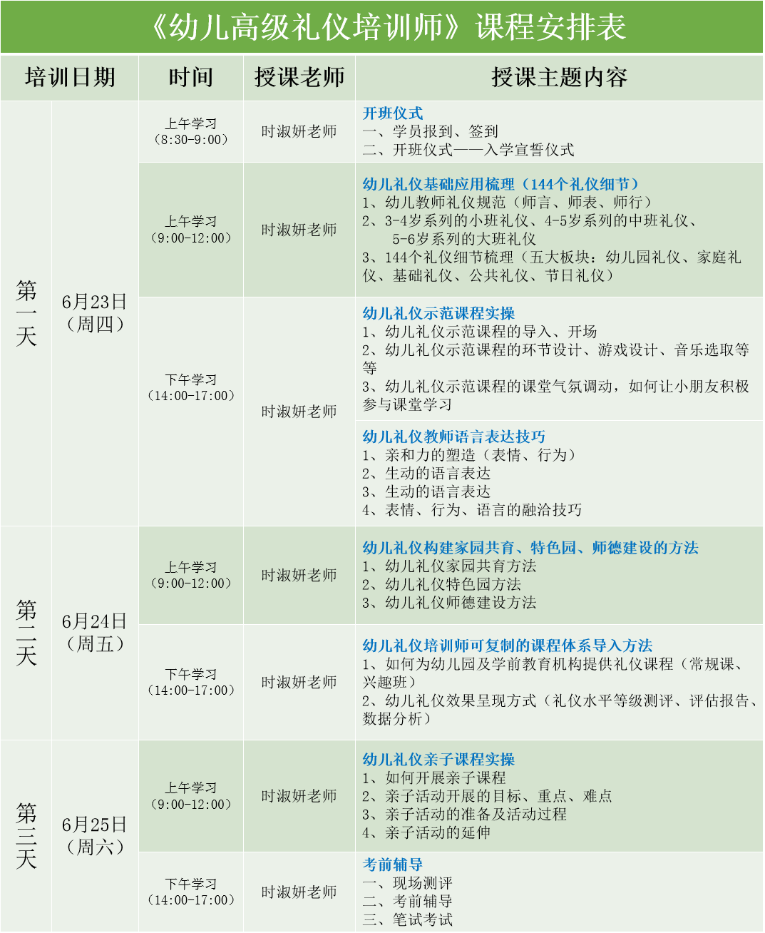 目前很多學(xué)前教育機構(gòu)、幼兒園已經(jīng)開展了禮儀課程,為了解決各地幼兒禮儀培訓(xùn)師資緊缺的問題,幫助幼兒禮儀教育工作者掌握禮儀教學(xué)訓(xùn)練內(nèi)容和教學(xué)規(guī)范、增強實際應(yīng)用授課能力、提高師資水平和質(zhì)量,建立專業(yè)幼兒禮儀培訓(xùn)教師隊伍,增強禮儀實際應(yīng)用及教育成果轉(zhuǎn)化,知行德禮教育、廣州市禮儀協(xié)會將于2022年6月23日--25日在廣州舉辦《高級幼兒禮儀培訓(xùn)師》詳情如下: