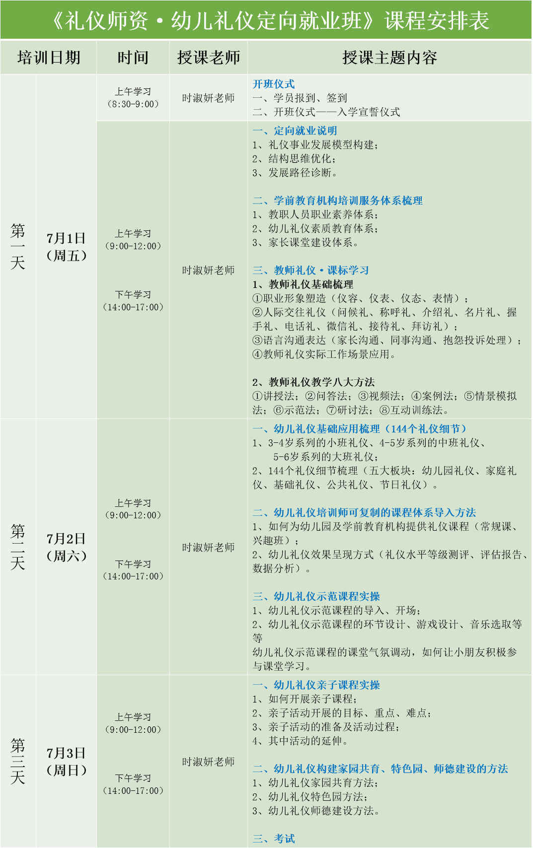 為加快高素質(zhì)禮儀培訓(xùn)師人才培養(yǎng)的步伐,增強禮儀培訓(xùn)師細(xì)分領(lǐng)域授課能力,全面提升禮儀培訓(xùn)師實際應(yīng)用解決問題能力,現(xiàn)面向以服務(wù)學(xué)前教育機(jī)構(gòu)(教職人員、幼兒、家長)的禮儀培訓(xùn)為職業(yè)發(fā)展方向人員,開展定向禮儀師資就業(yè)班。