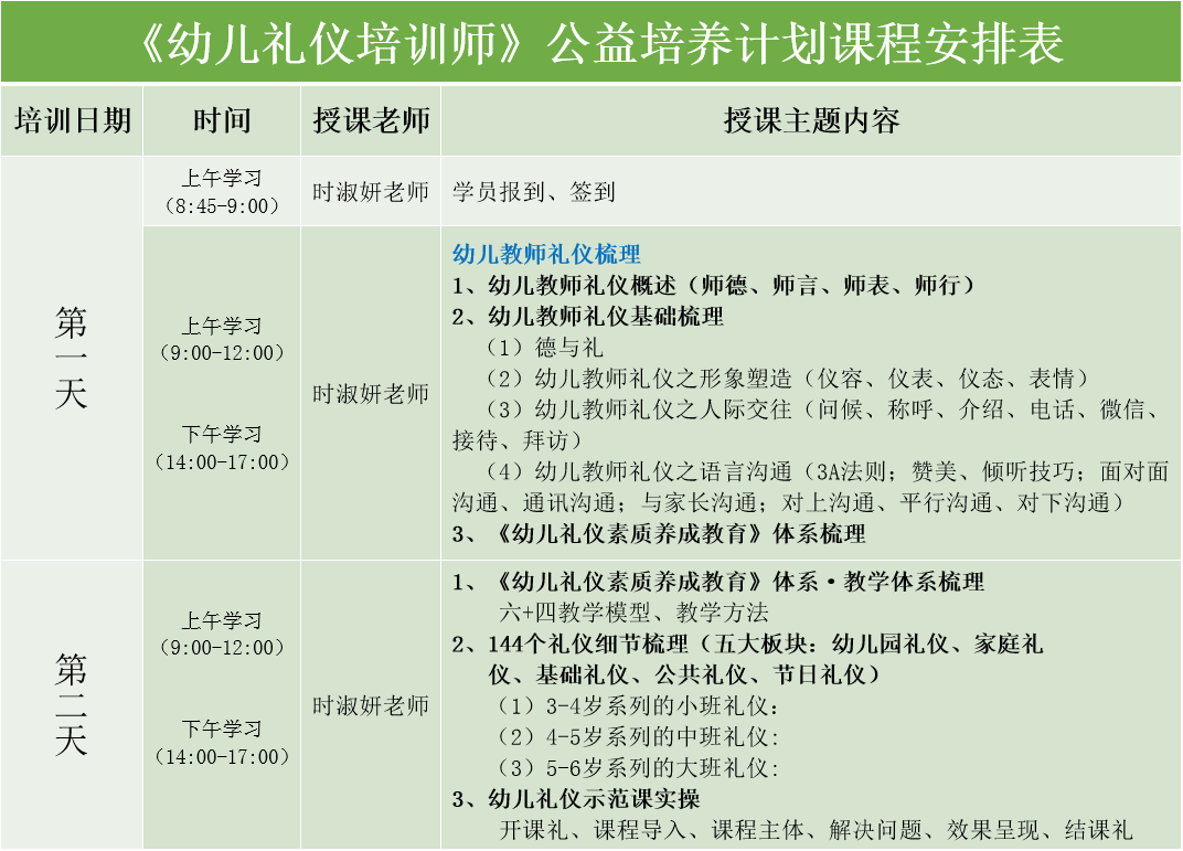 禮儀作為內(nèi)在的品德、品質(zhì)、修養(yǎng)的承載體和言行舉止、待人接物、與人交往溝通具體行為表達(dá),是成長(zhǎng)至關(guān)重要的素質(zhì),也是好家風(fēng)家教的成果展現(xiàn),更是社會(huì)文明程度的體現(xiàn)。為了解決幼兒禮儀培訓(xùn)師資緊張的問(wèn)題,幫助幼兒禮儀教育工作者掌握禮儀訓(xùn)練內(nèi)容和教學(xué)規(guī)范、增強(qiáng)實(shí)際應(yīng)用授課能力、提高師資水平,建立幼兒禮儀授課專業(yè)教師隊(duì)伍,增強(qiáng)禮儀實(shí)際應(yīng)用及教育成果轉(zhuǎn)化,廣州市禮儀協(xié)會(huì)、廣州市德禮教育將于2022年8月6日—7日在廣州開(kāi)展《幼兒禮儀培訓(xùn)師》公益培養(yǎng)計(jì)劃。詳情如下: