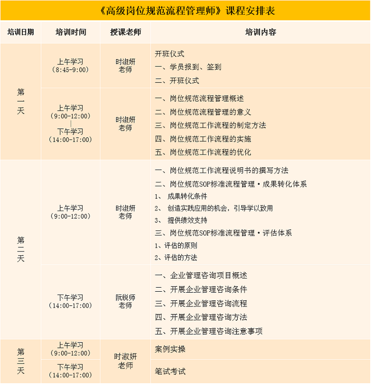 學習費用:5980元/人,含國內(nèi)權(quán)威機構(gòu)認證的 【高級崗位規(guī)范流程管理師】證書。(學習費用可刷公務卡繳費)。